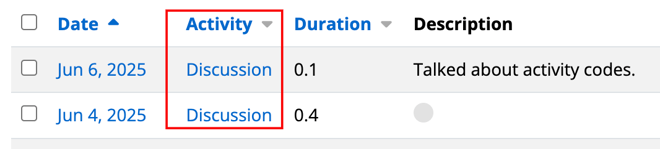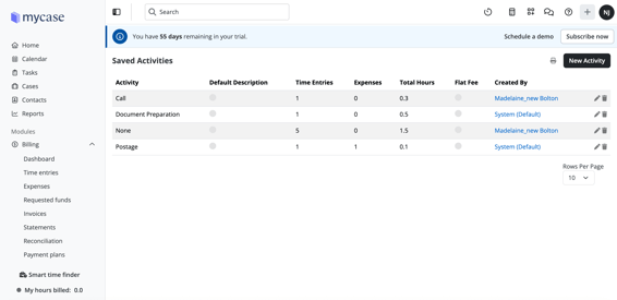 MyCase includes an activity type that can be assigned to each time entry. Saved activity types are often customized to each firm (see example below):