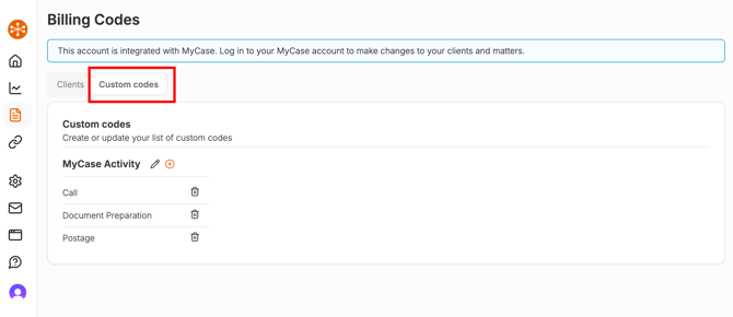 - Go to the Billing Codes page in Billables AI and click on the Custom Codes tab: