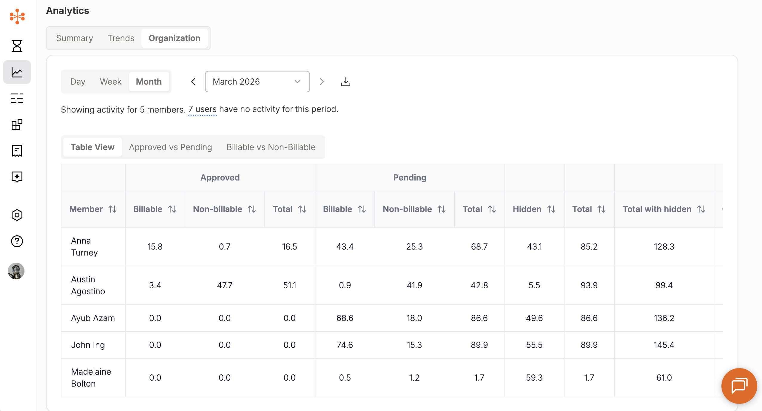 Note: Admins can view aggregated and summarized data, but do not have access to individual time entry details within Analytics.
