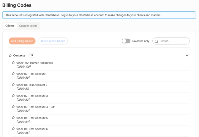 Upon successful completion, you'll see your clients and matters populate on the Billing Codes page: