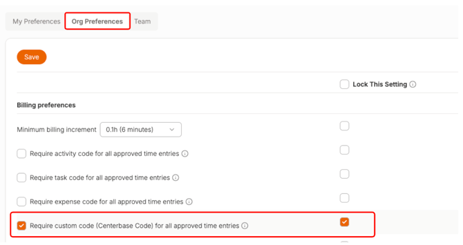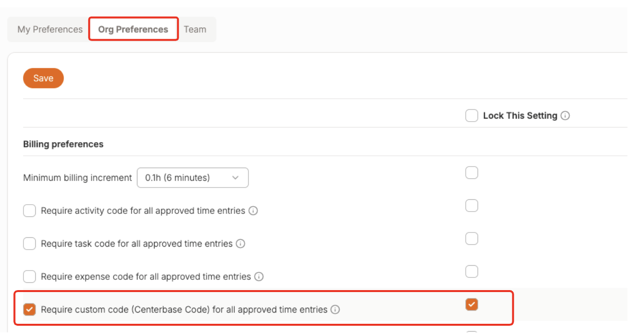 If your firm requires the Centerbase code for all your time entries, we recommend implementing an org setting that will require this to be inputted before time entries are approved.