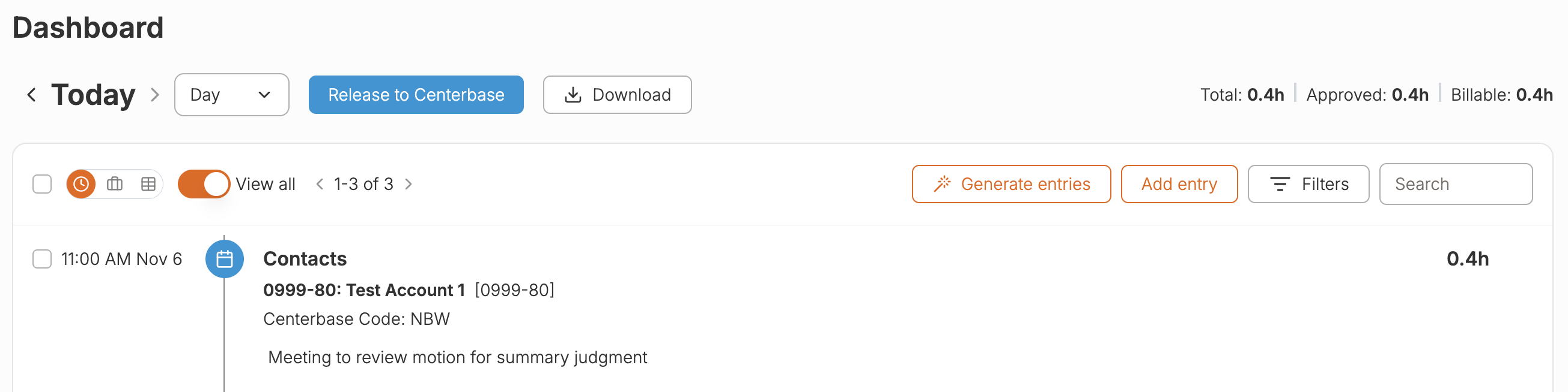 Review and approve your time entries directly in the Billables AI dashboard. Once you're done approving your time for each day, you can export all your time entries back to Centerbase by clicking the "Release to Centerbase" button at the top.
