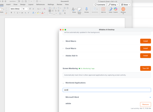 This workflow is used to add Excel, PowerPoint, and any other desktop applications you want Billables AI to track. Once added, each tracked app will appear in the Billables AI desktop program along with a timestamp showing when activity was last detected.