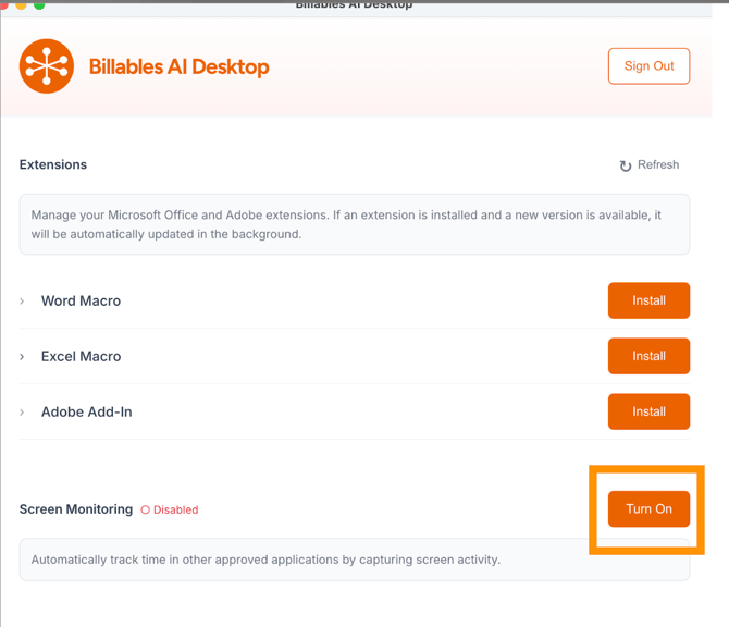 Step 4: In the Billables AI desktop app, scroll down to the screen monitoring section and click to turn on the feature:
