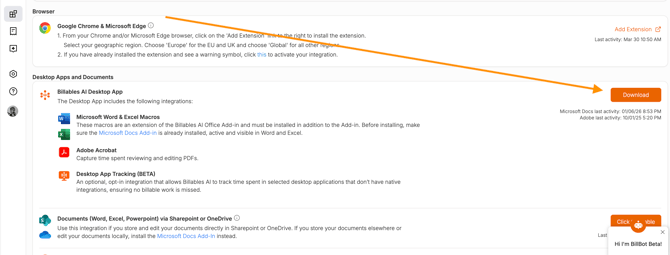 1) Visit the Integrations page and find the Billables AI Desktop App section and click "Download" to install the Billables AI Desktop App. The Desktop app allows you to integrate with Adobe.