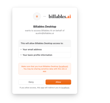 2) Once the Billables AI Desktop App is downloaded, you will be promoted to sign into your Billables account. Once you click "sign in," you will be redirected to your browser. Sign in and allow Billables AI to access your email and basic profile information.