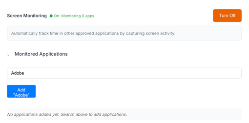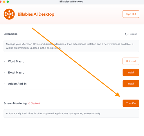 3) Once you've logged into your Billables AI Desktop App, please turn on the "Screen Monitoring" (Application Capture) option.