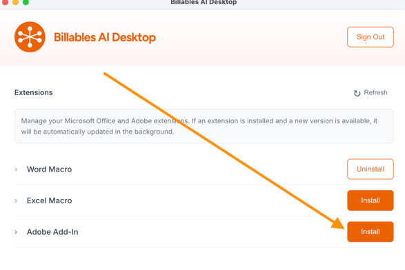 Note: The search bar may auto populate Adobe if Adobe is opened behind the Billables AI Desktop App window.