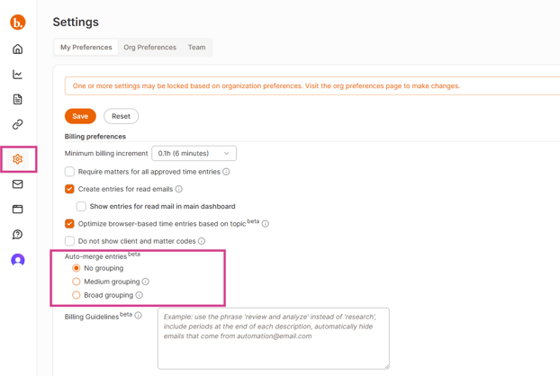 Once saved, Billables will automatically begin merging entries according to your chosen grouping level. Billables will only merge entries when it has a high degree of confidence for the client matter matching.