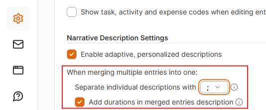 Within the settings page, you can customize how merged entry descriptions are presented by locating the narrative descriptions setting. You can choose to separate the narratives by either a period or a semi-colon, and you can also choose to include the duration for each activity within the description as well.