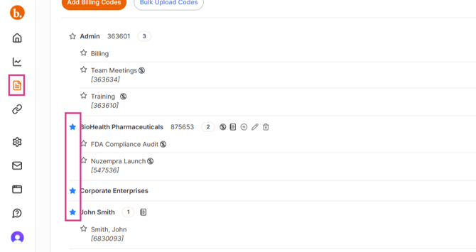 To do this, visit the billing codes page and select the star symbol next to any client or matter you wish to favourite. Favorited billing codes are marked with a blue star.