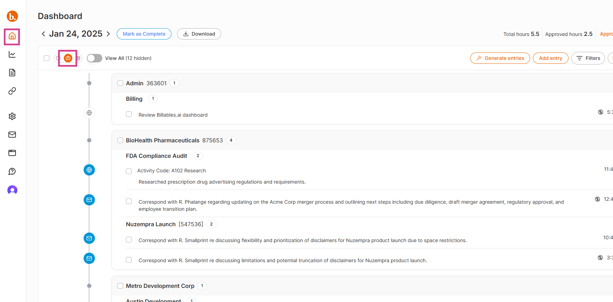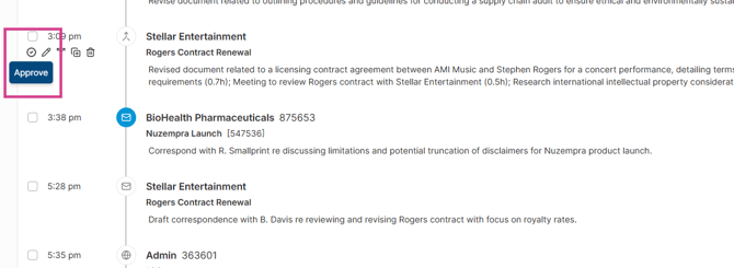 Approving your entries is the most important step in ensuring Billables AI accurately tracks your time. We recommend taking a few minutes every day to review your entries and approve ones that portray the activity correctly. This will improve Billables AI's ability to tailor your entries as well as improve client-matter matching in the future.
