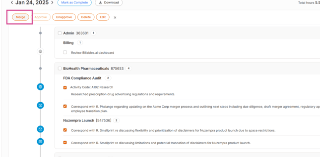 If you wish to merge multiple entries, you have the ability to manually merge them. By manually merging your entries, you can improve Billables AI's ability to group entries in the future.