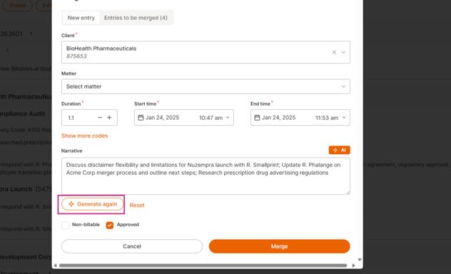 You can make any changes to the entries before you merge them (Billables AI automatically sums the total duration of all entries).