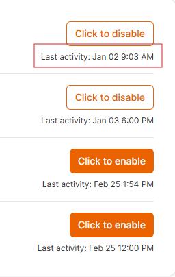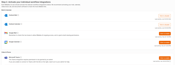 Be sure to check the date and time of the last activity for each integration to confirm they’re all active. If any integration becomes disabled, Billables AI will send a notification email to inform you. Add notifications@billables.ai to your contacts for timely alerts.