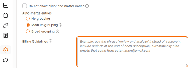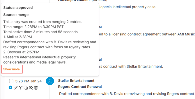 We suggest you consider enabling automatic entry merging, which will automatically group similar and related records. In addition, we recommended adding billing guidelines to help further customize your narratives. For example, you can use billing guidelines to replace "research" with "review" and hide certain names and emails from the description.