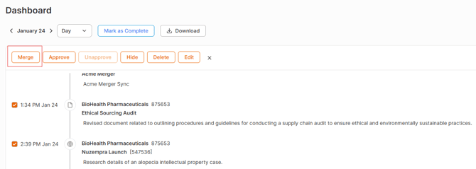 Both Merged and auto-merged entries appear with a merged arrow icon on your dashboard.