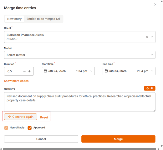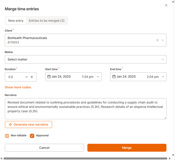 You will have the ability to edit the entry before merging. Billables AI will automatically combine the total durations of all merged entries.