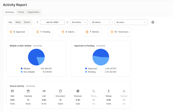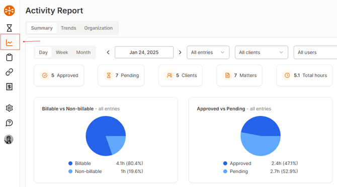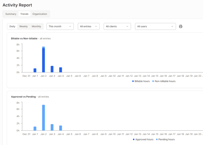 You can also view trends about your billable and approved time in either daily, weekly, or monthly increments.