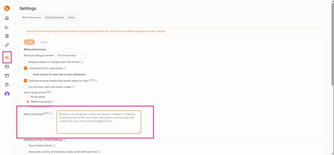 Step 1: Open Settings and Access Billing Guidelines Navigate to the settings page. In the My Preferences tab, locate the billing guidelines section.