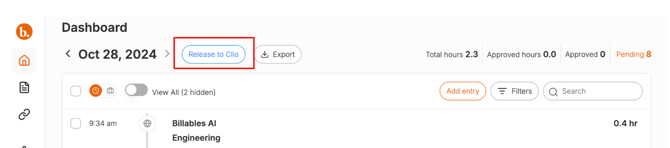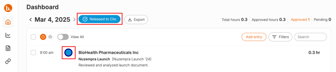 If the button at the top of your dashboard reads "Released to Clio" with a checkmark, this means all approved entries were successfully sent to Clio. Otherwise, you'll see a red outline around the time entries that were not successfully released.