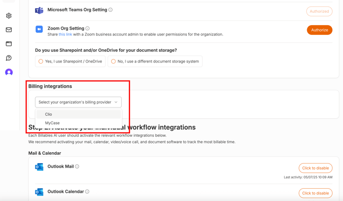 Go to the Integrations page on Billables and select Clio from the Billing integrations dropdown: