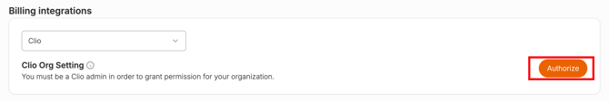 Click on the Authorize button. You must be a Clio admin to authorize on behalf of the organization.