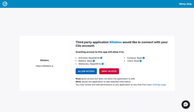 First, ensure that the Clio account and Billables account for each user are using the same work email. Not sure how to check? See FAQs for more info.