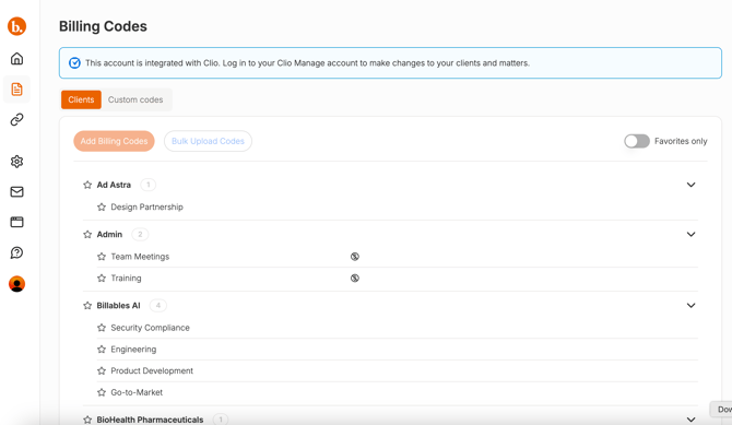 Your billing code page should now show that your codes are managed by Clio.