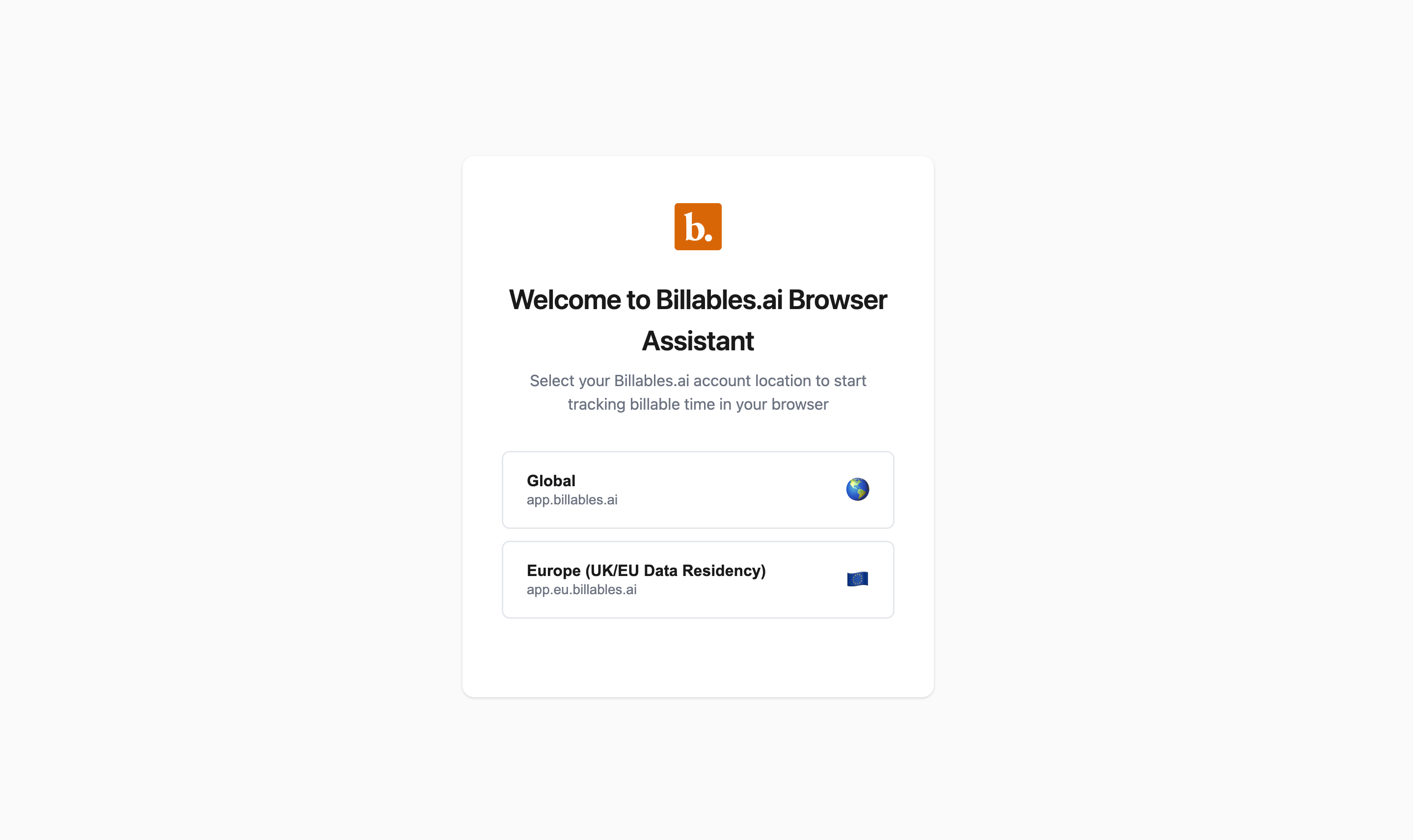 The extension will open a tab prompting you to select the region for your Billables account. Choose "Global" if you sign into your dashboard at https://app.billables.ai and "Europe" if you use the https://app.eu.billables.ai site for EU data residency requirements. You will be redirected to the Billables site after selecting your region.