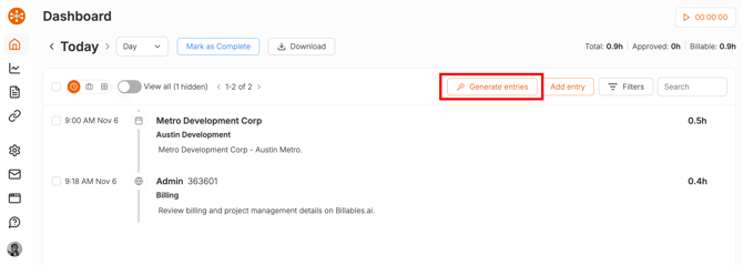 Billables AI time entries typically every 15 minutes on your dashboard. If you'd like to generate your time entries on demand, you can click the "Generate" button on your dashboard. Note that some time entries (particularly for video calls) take longer to generate, potentially several minutes.