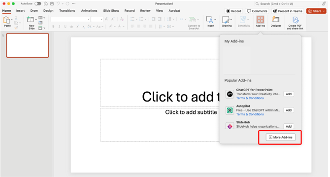 If you click on "More Add-ins" and you do not see the screen above, this your system will need to wait for Microsoft to propogate the Add-in to all users. This can sometimes take up to 24 hours (See Microsoft Help Center for more information).