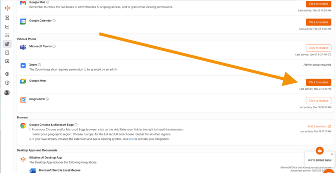 Go to your integrations page on the Billables website. Select "Click to Enable" to activate your Google integration.