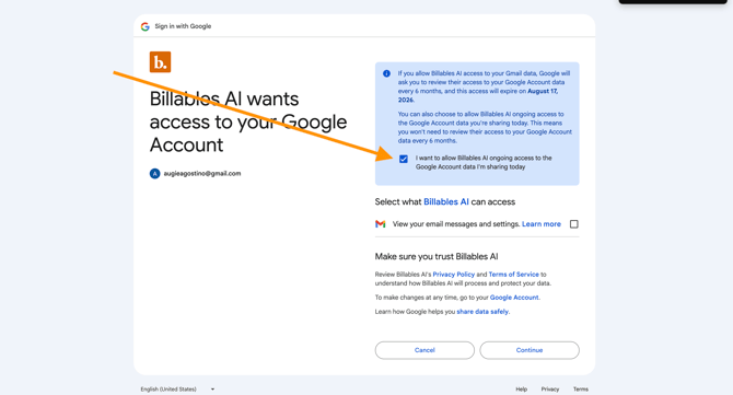 You may be prompted to Allow Billables AI ongoing access to your Google Account data. Check the allow box.