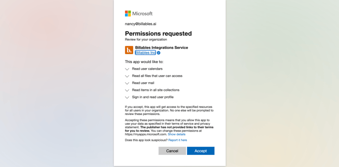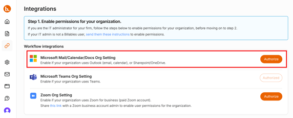 Enable delegated permissions for Mail, Calendar and Sharepoint/OneDrive docs by visiting this admin consent URL or clicking on the link from the Billables Integrations page.