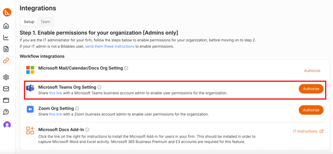 Only Billables AI admin accounts have access to the org-level integration permissions.