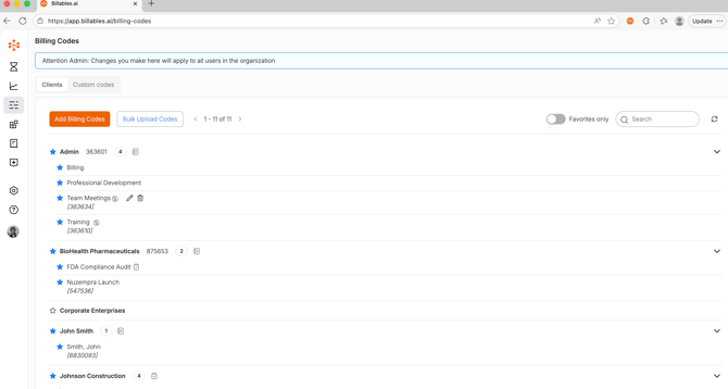Step 3: Allow the upload of your client matters. This may take some time, up to a few hours, but Client Matters will begin to populate on your Billing Codes page.