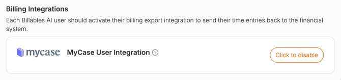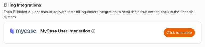 Once the organization has set up the billing code integration, each individual user should set up their individual user integration. This will allow the users to release their time to MyCase.