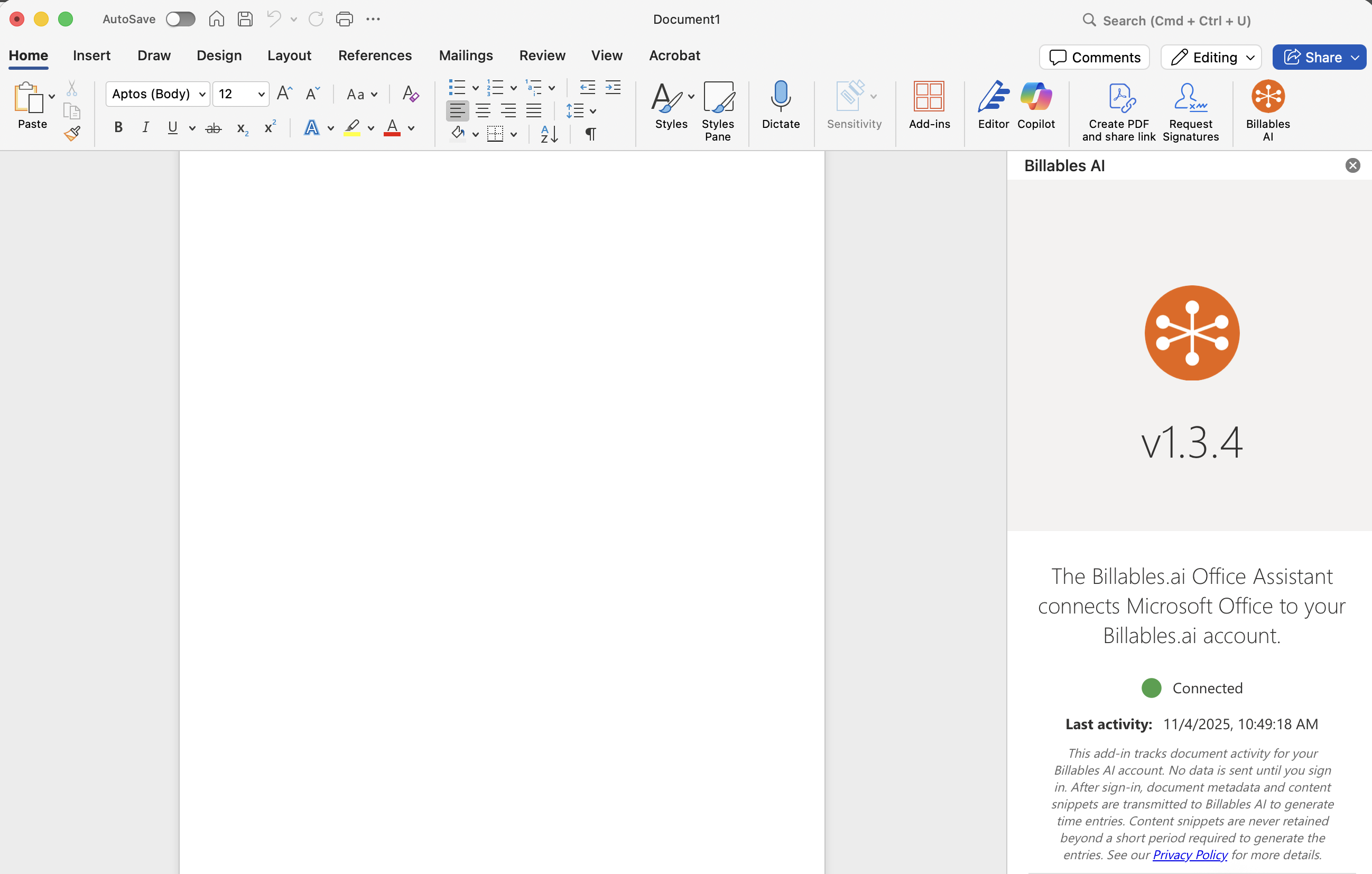 The new Add-In should be deployed to your application. Please re-start Word and confirm you're seeing version 1.3.4: