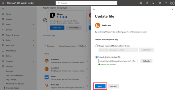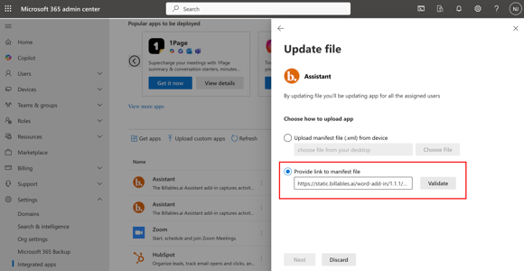 Click on "Provide link to manifest file" and add the following link: https://static.billables.ai/word-add-in/1.2.0/manifest.xml