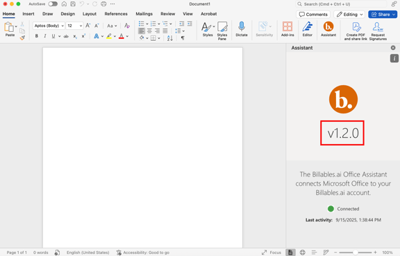 You should see a confirmation screen. This means the Add-In has successfully updated. Please re-start Word for the Add-in update to take hold. If you see v1.2.0, that means you have the latest version: