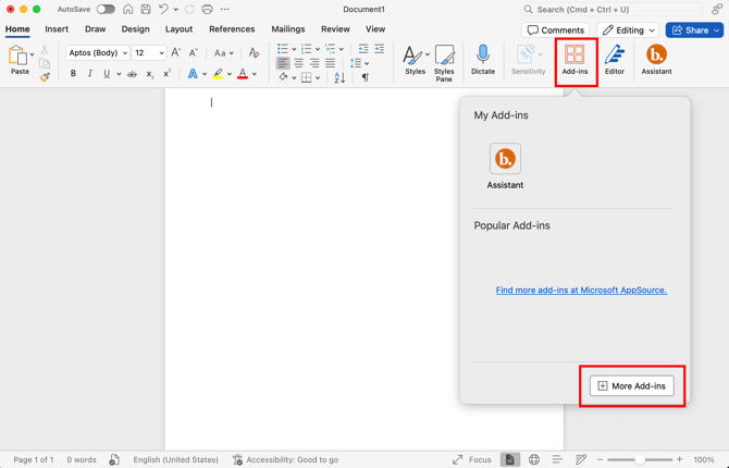 Click the Add-In icon at the top of your Word app, then select "More Add-ins"