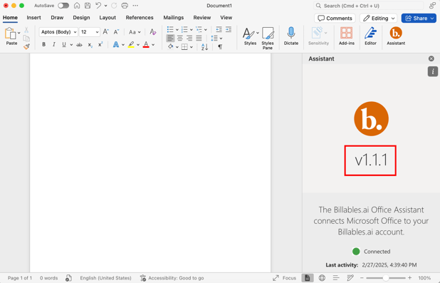 The new Add-In should be deployed to your application. Please re-start Word and confirm you're seeing version 1.1.1: