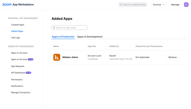 button next to the Billables-Admin app. Once this button is clicked, the zoom integration will be disabled for all users on the account and we will no longer generate billable records for Zoom activity.