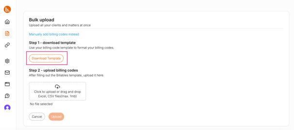Once you have the ProLaw data, re-format the data using the Billables AI bulk upload template found on the Billing Codes page.