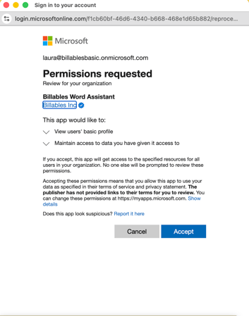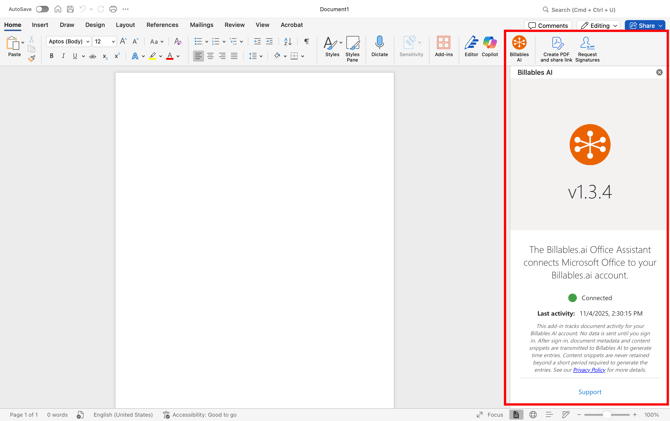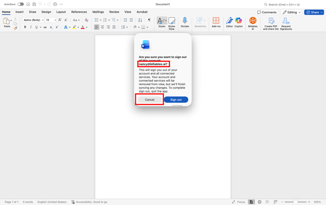 - Open a Word or Excel document and check that you're logged into the same email as your Billables AI account