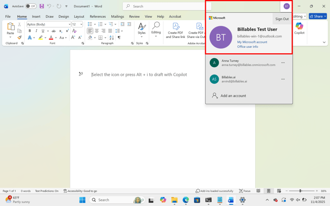 - Make sure you're logged into your Microsoft account in Word/Excel under the same email as your Billables AI account: