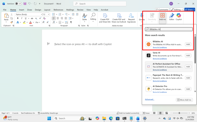 - Click on Add-Ins icon in the toolbar, then search for Billables AI. Click Add to enable the Add-in: