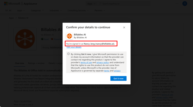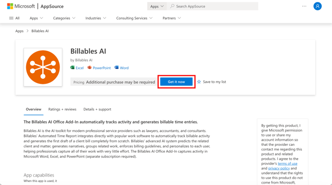 - Go to the Billables AI app page in the Microsoft App Store and click "Get it Now":