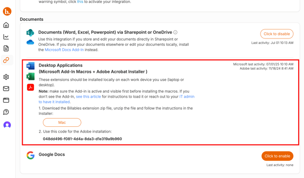 - Proceed with installing the Macros on the Billables AI integration page. This will activate the Add-in for you automatically each time you open a document.